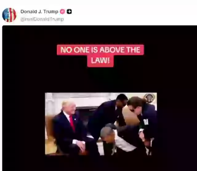 The video, shared on Trump’s own social media platform, Truth Social, shows Barack Obama being taken into custody. In the clip, the former president is seen speaking at a rally, stating “no one is above the law,” before being depicted being arrested and placed in a cell with an amused Trump observing.