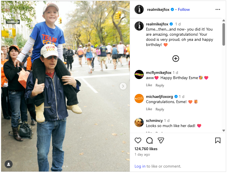 In an Instagram post, Michael J. Fox shared the moment Esmé saw her family along the streets as she ran the marathon and approached them with a big smile.