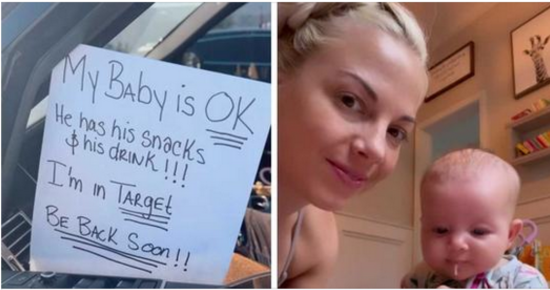 The video in question shows a close-up of a handwritten sign taped inside the window of a car, reading: “My baby is OK. He has his snacks and a drink! I’m in Target. Be back soon!”