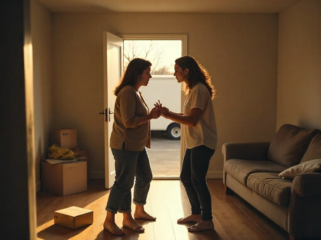 Our friends tell me to get a lawyer, his mother—dead—used to say family sticks together. My daughters are furious; neighbors whisper that the moving truck outside is for “our” furniture. I went to the house to stop it and found the front door open, the living room emptied, and my wedding portrait on the floor surrounded by packing tape. My husband wasn’t there; just my sister-in-law on the sofa, a cup of tea, and a smile I didn’t recognize. She set down the cup and said, “You should have negotiated sooner,” then picked up my phone and…