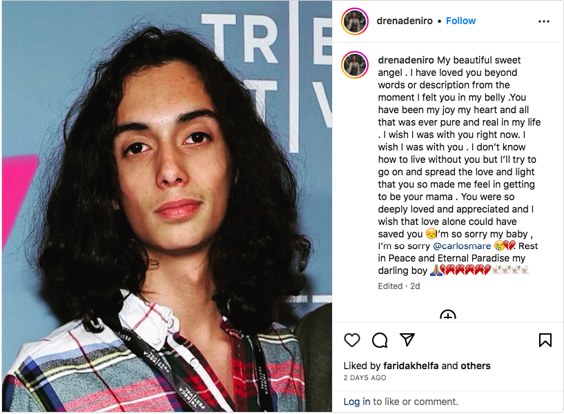 De Niro’s adopted daughter Drena, 55, took to social media to confirm her son’s sudden passing, writing on Instagram: “My beautiful sweet angel. I have loved you beyond words or description from the moment I felt you in my belly.”
